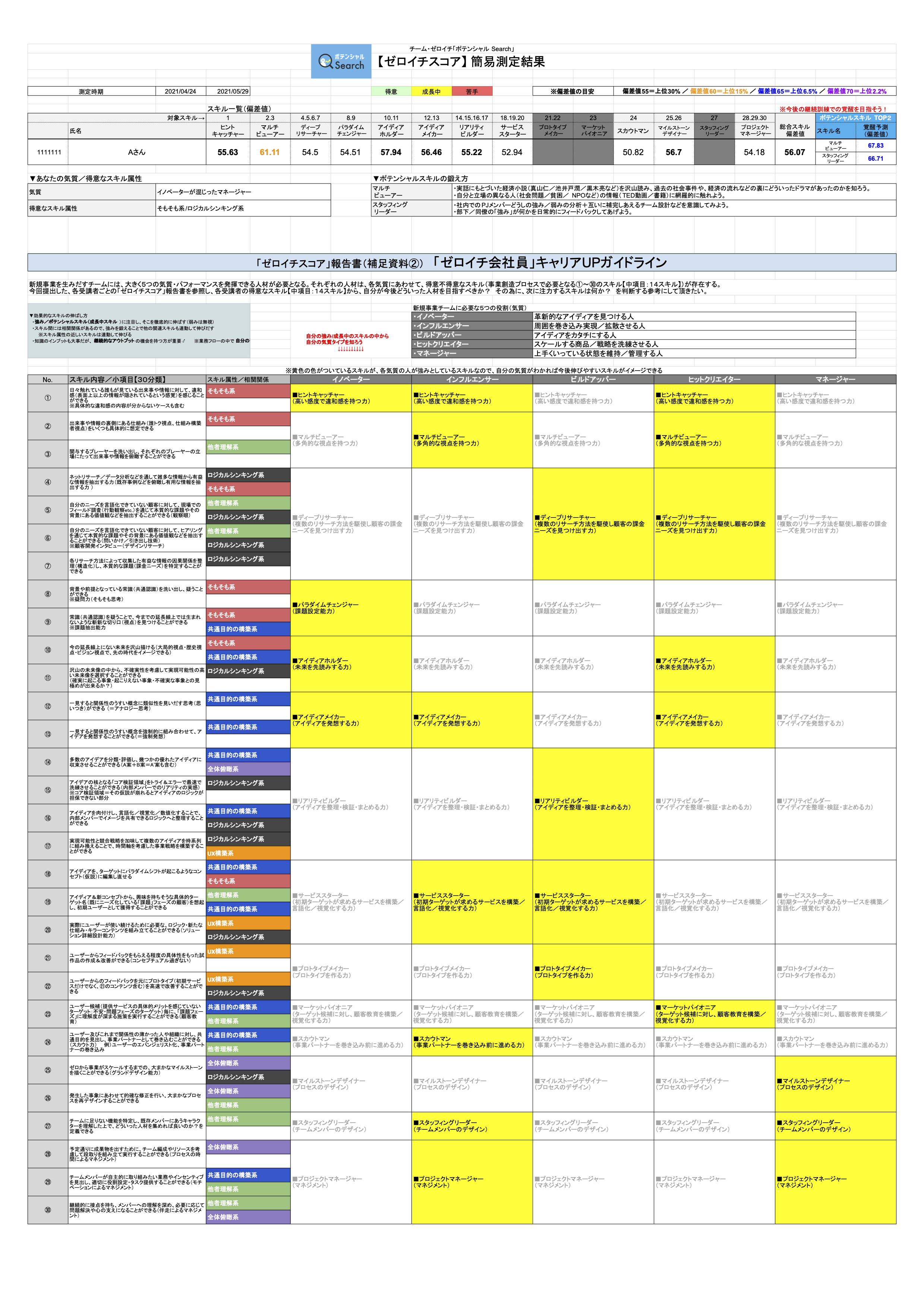 当社の「ゼロイチスコア」はワークショップでの実際の行動を、最も近い所で観察している同チームのメンバーからの評価を元に、独自アルゴリズムで評価基準を統一して自動算出されています。人事異動や評価査定という人の人生を左右するシーンでも十分に活用頂ける前提で精緻なスキル測定が実現できるよう「ゼロイチスコア」は開発されています。