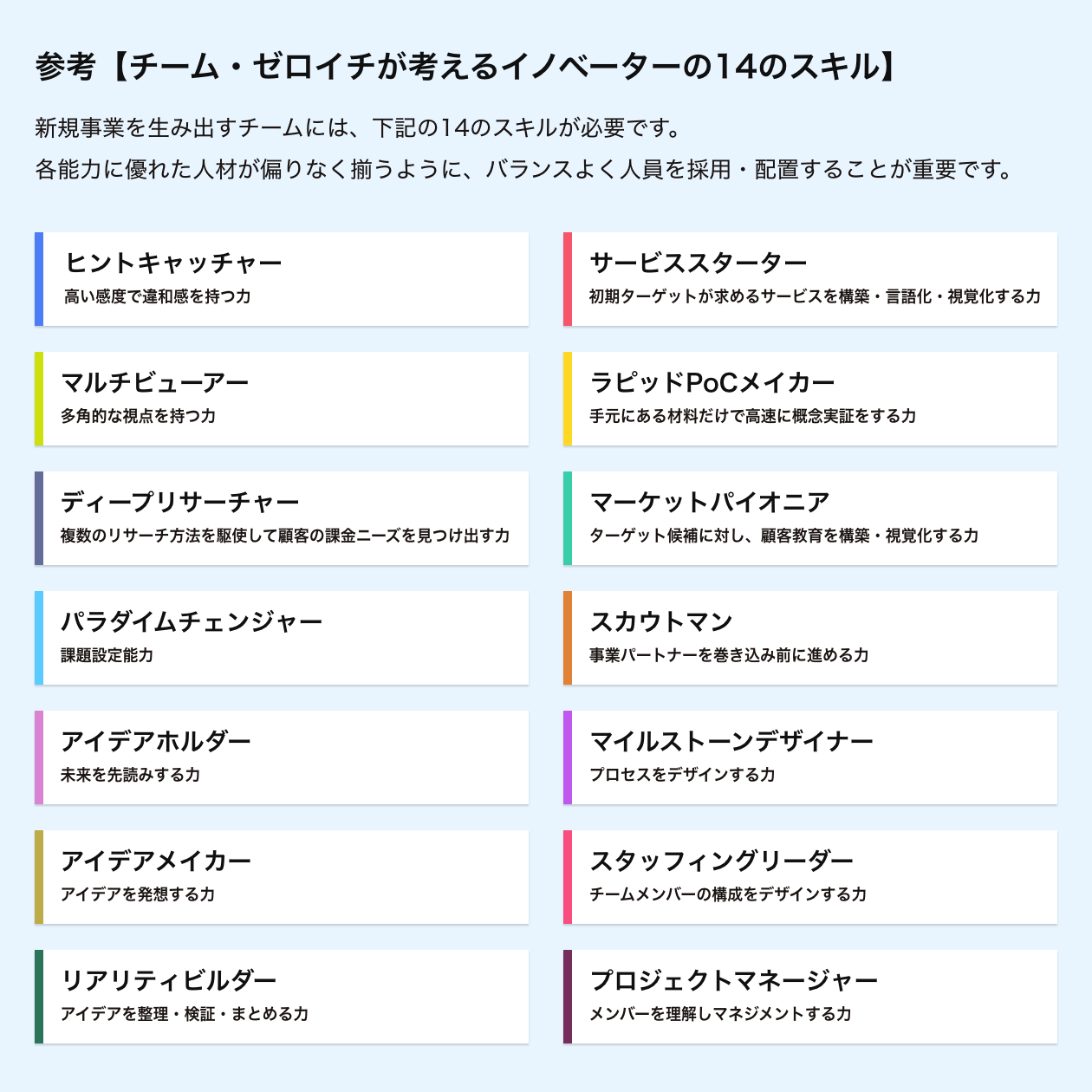 イノベーター一人ひとりの得意なスキルを見極め、そのスキルを集中して磨くことのできる環境や業務内容を提供する必要があります。